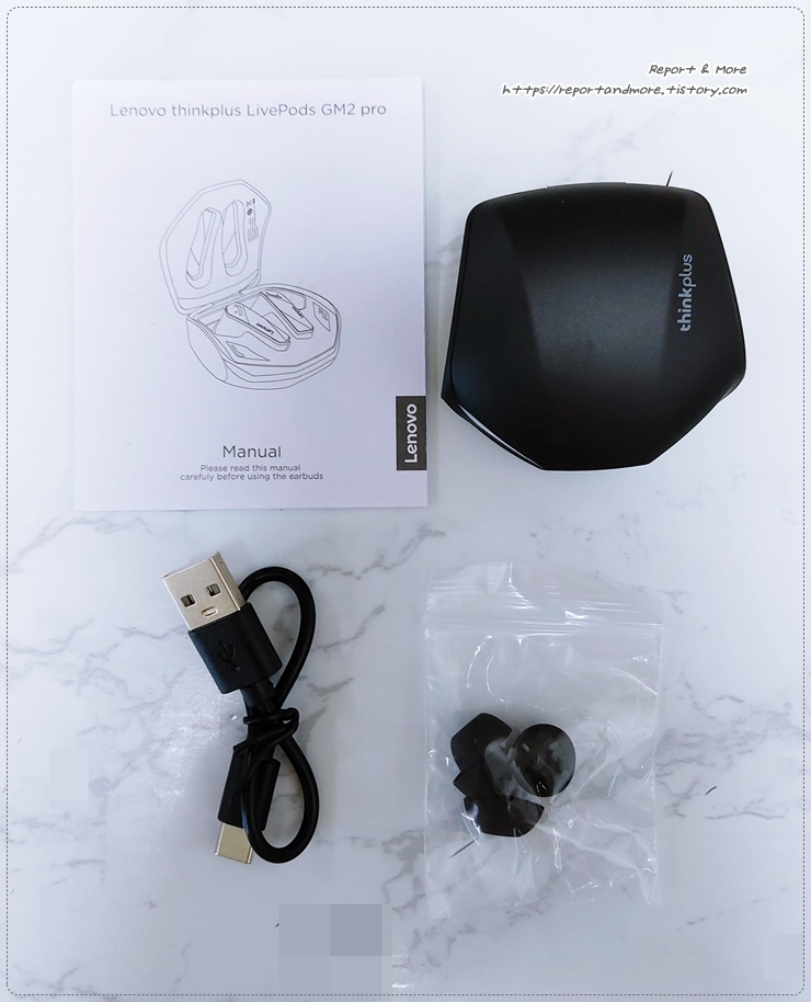 영문 설명서, 본품, C타입 충전케이블, 귀에 꽂는 이어폰 고무캡이 전부입니다.