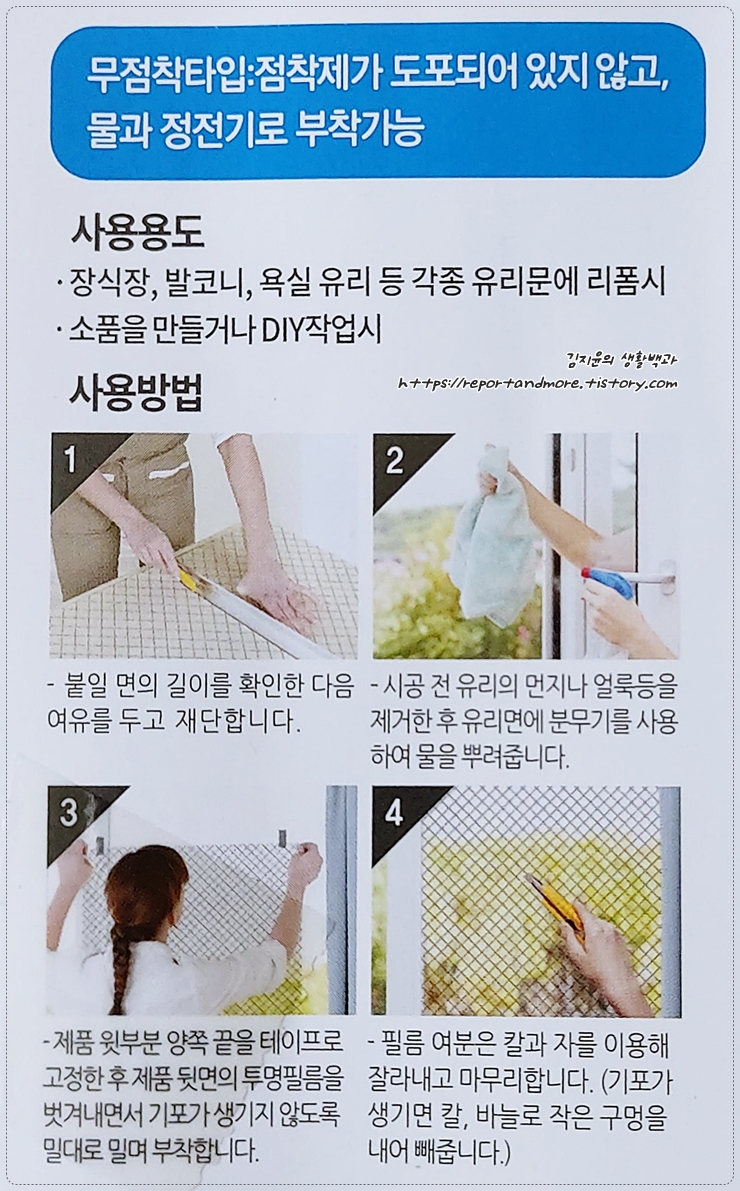 저는 무점착(스프레이로 물을 분사 후, 그냥 붙이는 제품)으로 구매했습니다.