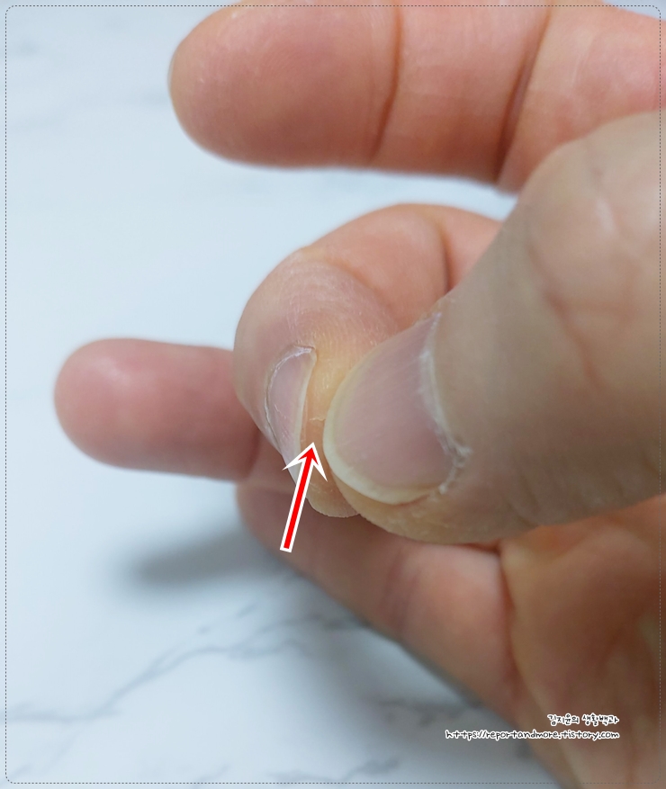 오호~ 손톱과 검지 손가락 끝을 대각선으로 베였는데,