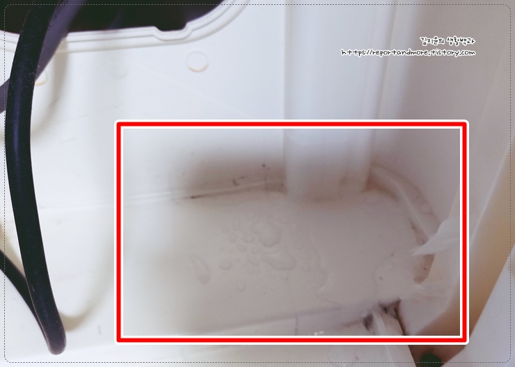 뚜껑을 열어보니, 에어컨 안쪽 바닥에 물이 고여있네요.