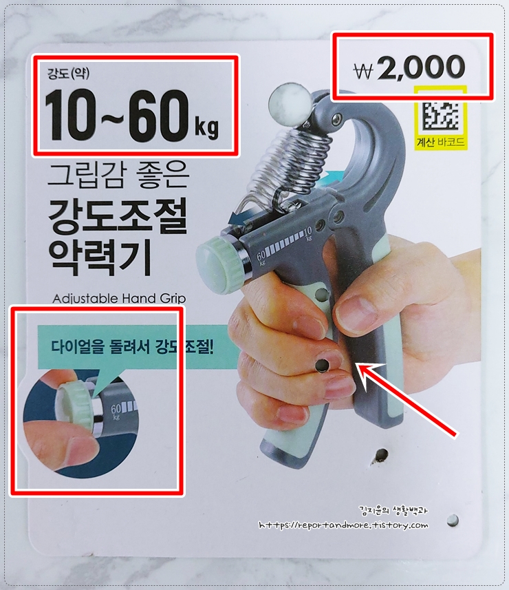 다이소 악력기 옆을 보시면, 60kg - 10kg라고 무게(약력 단계)가 적혀있습니다.
