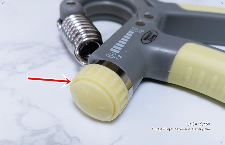 다이소 악력기 앞에 보이는 다이얼(노브)을 시계방향으로 돌리면 점점 강해지고,