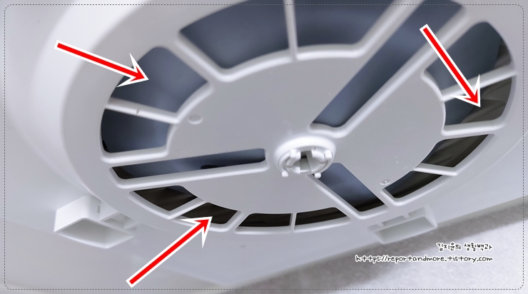 욕실 환풍기를 작동시키면, 이렇게 실리콘 날개가 환풍기의 힘 때문에 들어 올려지면서,