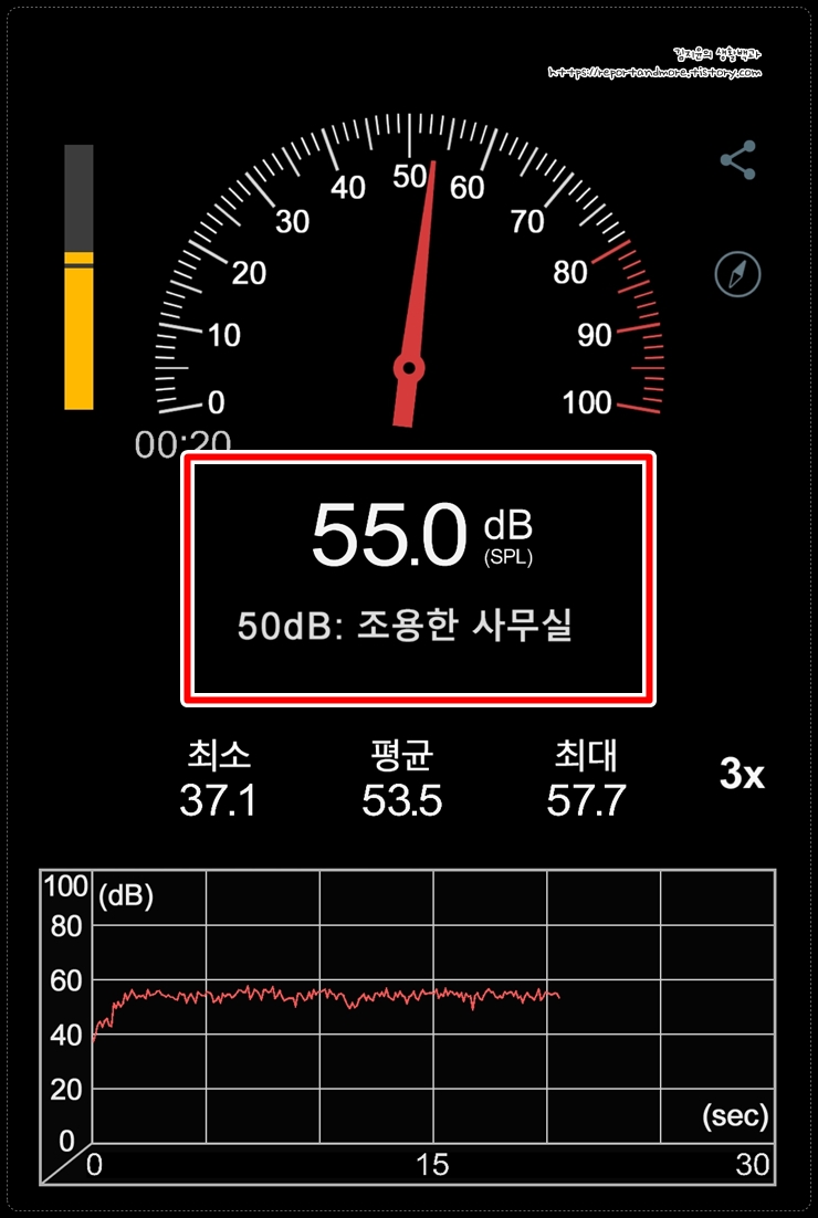 휴대폰 어플 소음측정기로 해 보았을 때에, 55.0 데시벨 정도 나오네요.