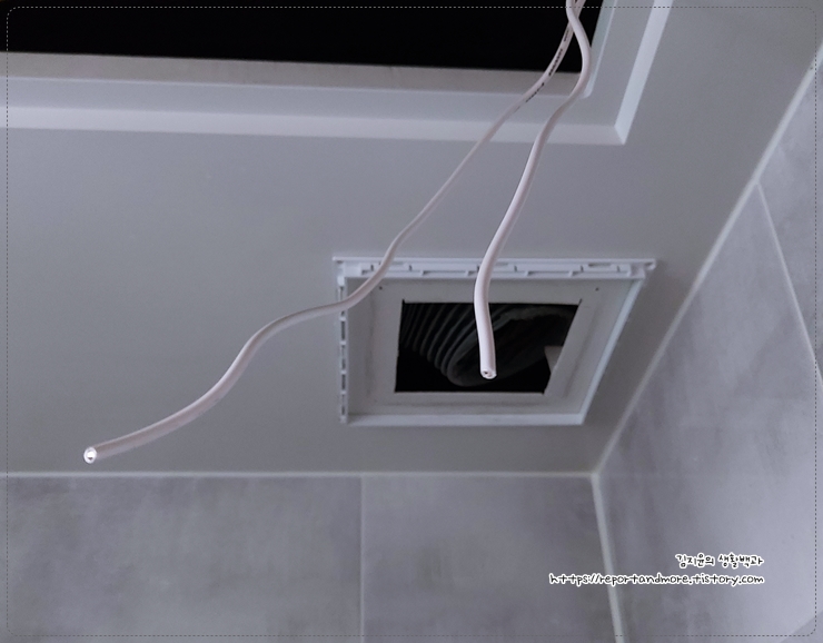 욕실 천장에 있는 커버를 열고, 그 안에 전기선을 확인해 보았습니다.