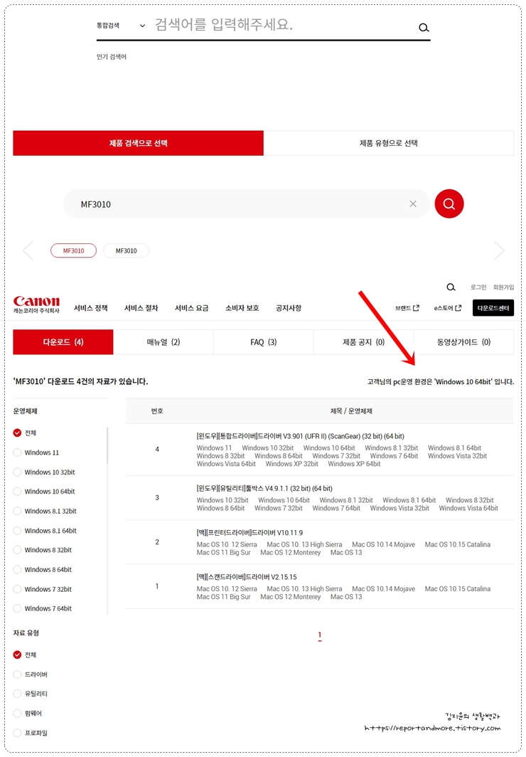 오호~ '캐논코리아 다운로드센터 웹사이트'에서 자동으로 저의 컴퓨터를 분석해서 자세히 알려줍니다.