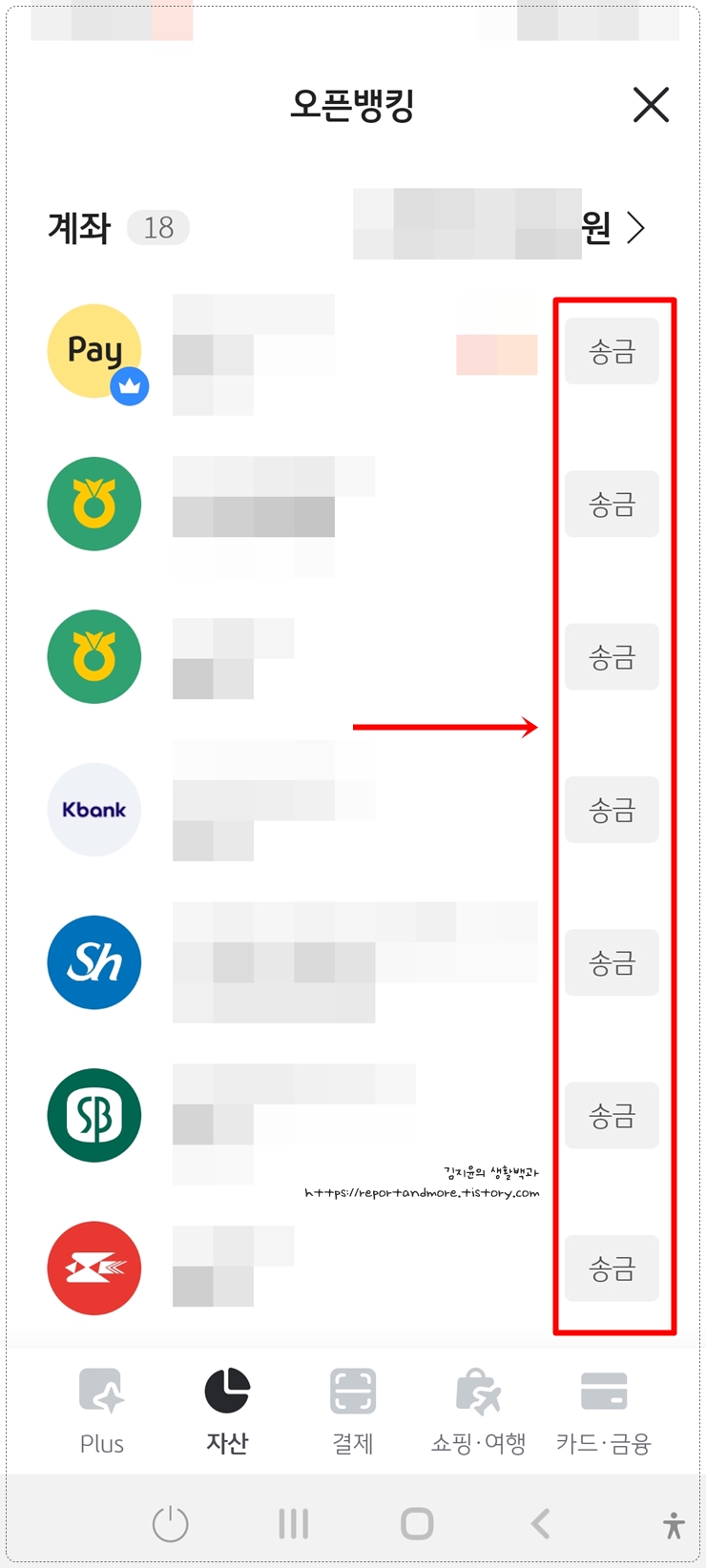 돈을 인출하고 싶은 은행 옆에 있는 [송금]을 누르면, 송금할 수 있는 창이 나옵니다.