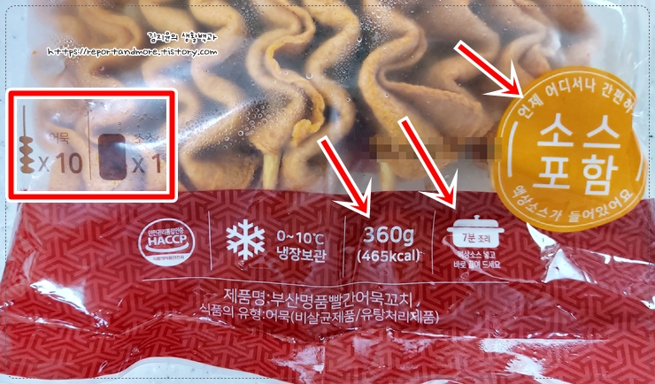 총중량은 360g이고요, 어묵꼬치가 10개나 되는데, 칼로리는 생각보다 낮은 465kcal입니다.