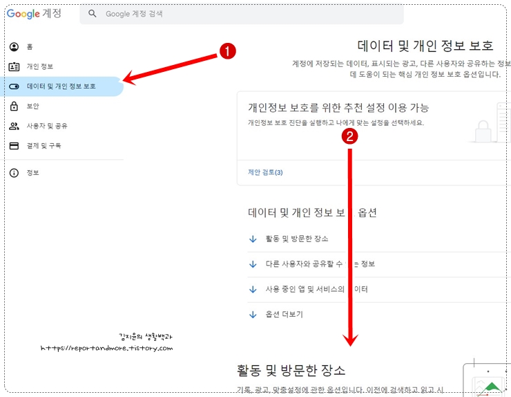 왼쪽에 보시면, [홈, 개인 정보, 데이터 및 개인 정보 보호, 보안...]이 있는데요,