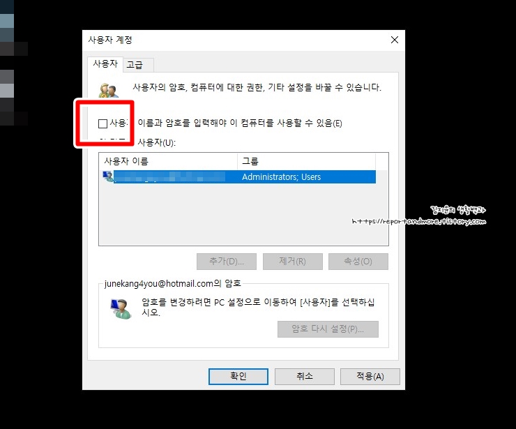 거기에 [사용자 이름과 암호를 입력해야 이 컴퓨터를 사용할 수 있음]이 보이실 겁니다.
