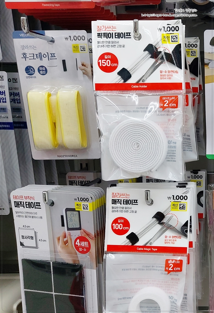 저희 동네 다이소에서 팔고 있는 모든 벨크로를 다 찍어 보았습니다.