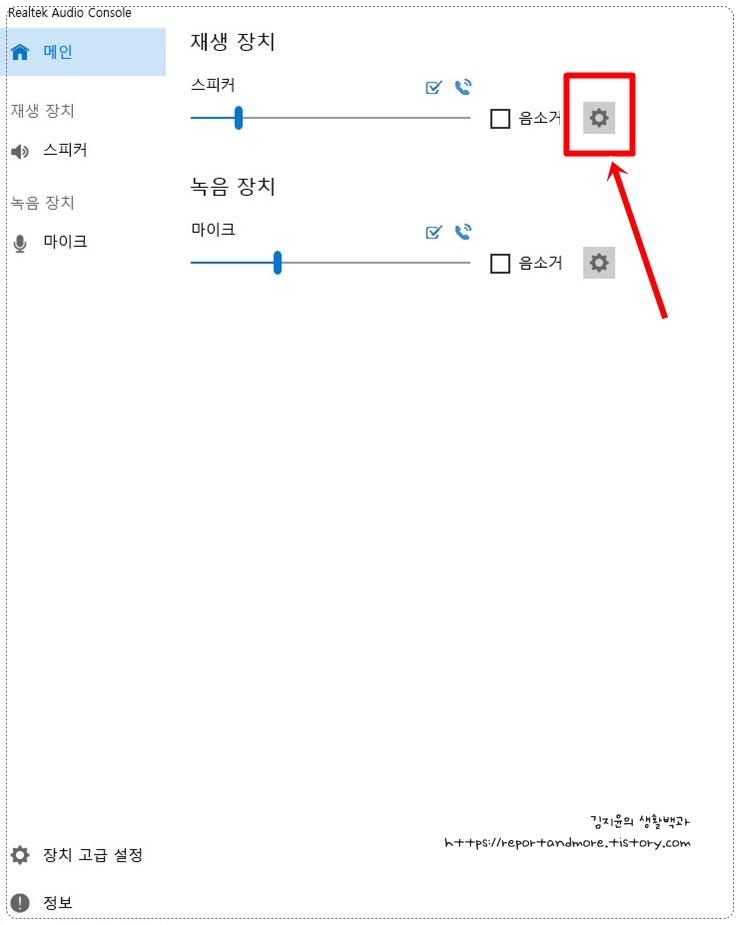 소리를 조절해야 하니까, [스피커]에 해당하는 [톱니바퀴(설정)]을 클릭해 줍니다.