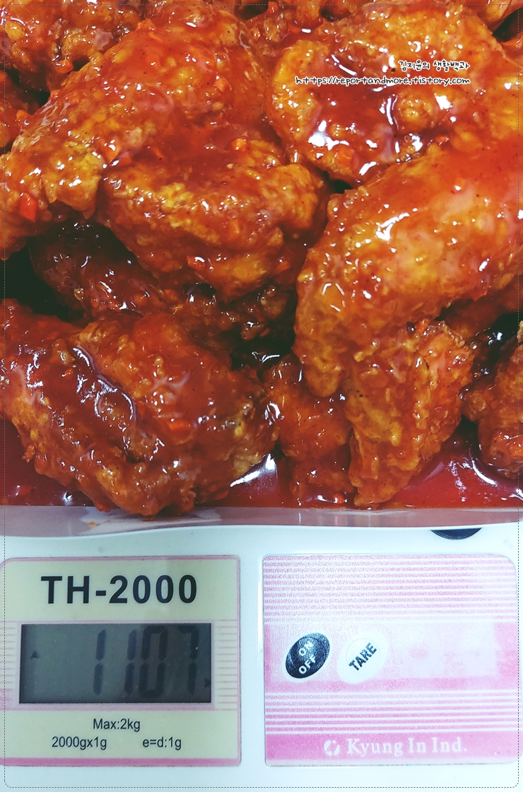 네네치킨의 양념치킨의 무게는 무려 1,107g입니다.