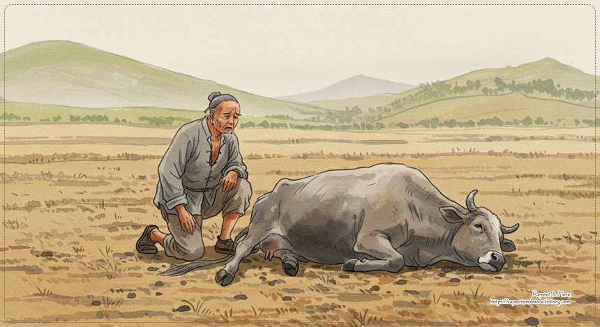 한 농부가 소의 뿔이 휘어진 것을 보고 이를 바로잡으려 했습니다.