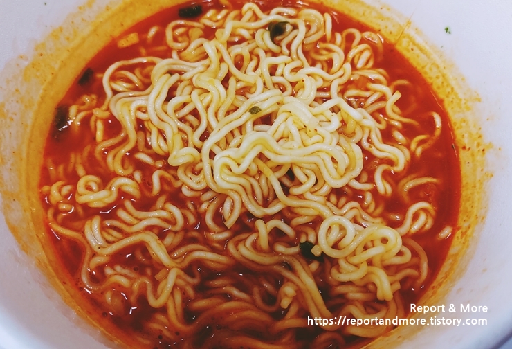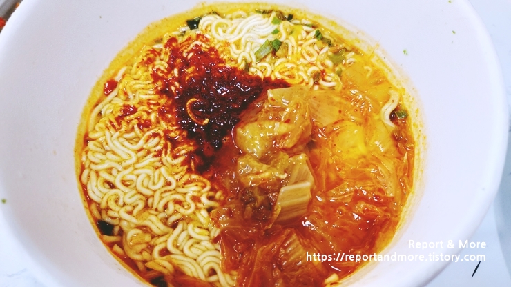 ** 한 가지 팁을 드리자면, 김치가 분말이 아니라서, 어느 정도 열을 뺏어 가는 듯하네요. 그래서, 팔팔 끓는 물을 넣었는데요, 그렇게 뜨겁지 않다는... 뜨거운 라면 좋아하시는 분들은 팔팔 끓는 물을 넣으셨더라도 '잠깐'이라도 전자레인지에 돌려서 드시는 것을 추천드립니다.