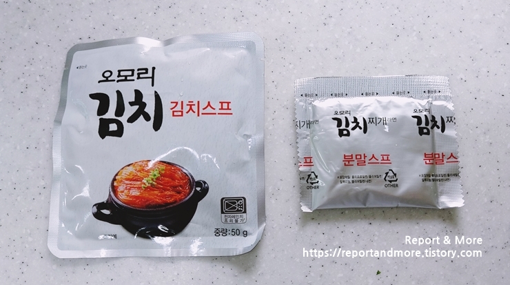 '분말 스프'와 '50g의 오모리 김치 스프'를 넣은 모습입니다.