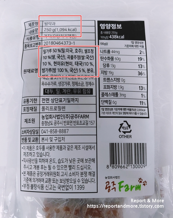 성분의 50%는 밀가루고요, '밤'은 가루 형태로 전체 내용물의 5% 내요.