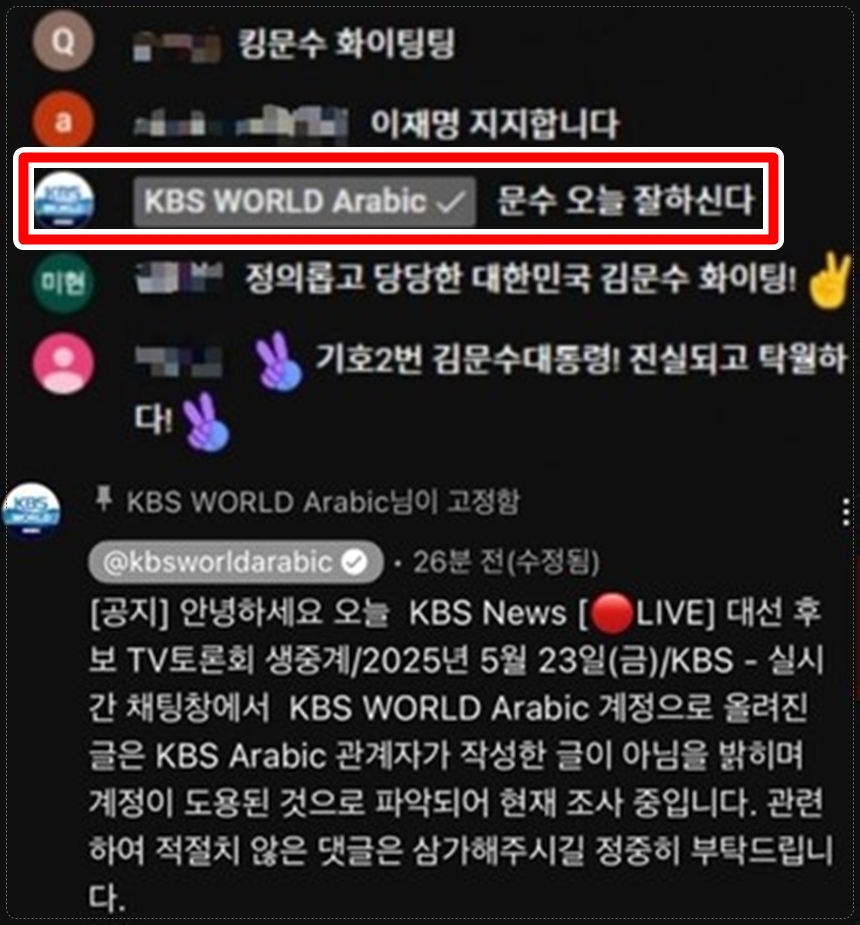 하지만 지난 23일 발생한 KBS 공식 유튜브 계정의 특정 후보 지지 댓글로 인해,