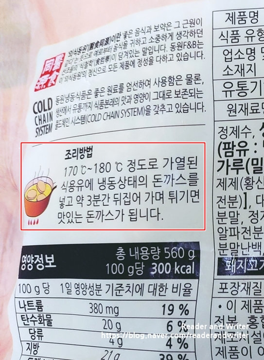 조리 방법으로는 170~180도로 냉동상태의 돈까스를 3분간 기름에 튀기는 것이었습니다.