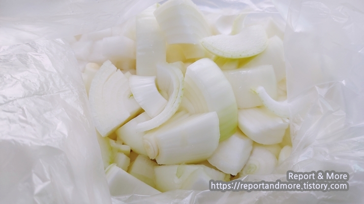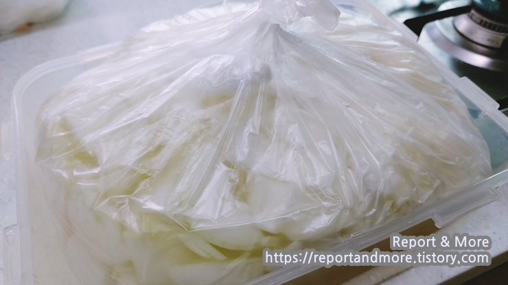 (참고: '무'는 시간이 좀 지나도 아삭함이 유지되지만, '양파'는 물러질 수 있으니까요, 양파 먼저 드시던지, 아니면 양파를 빼 주세요.)