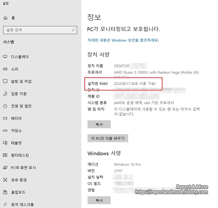 오호~ '설치된 RAM 20.0GB' 정확히 인식되었군요.