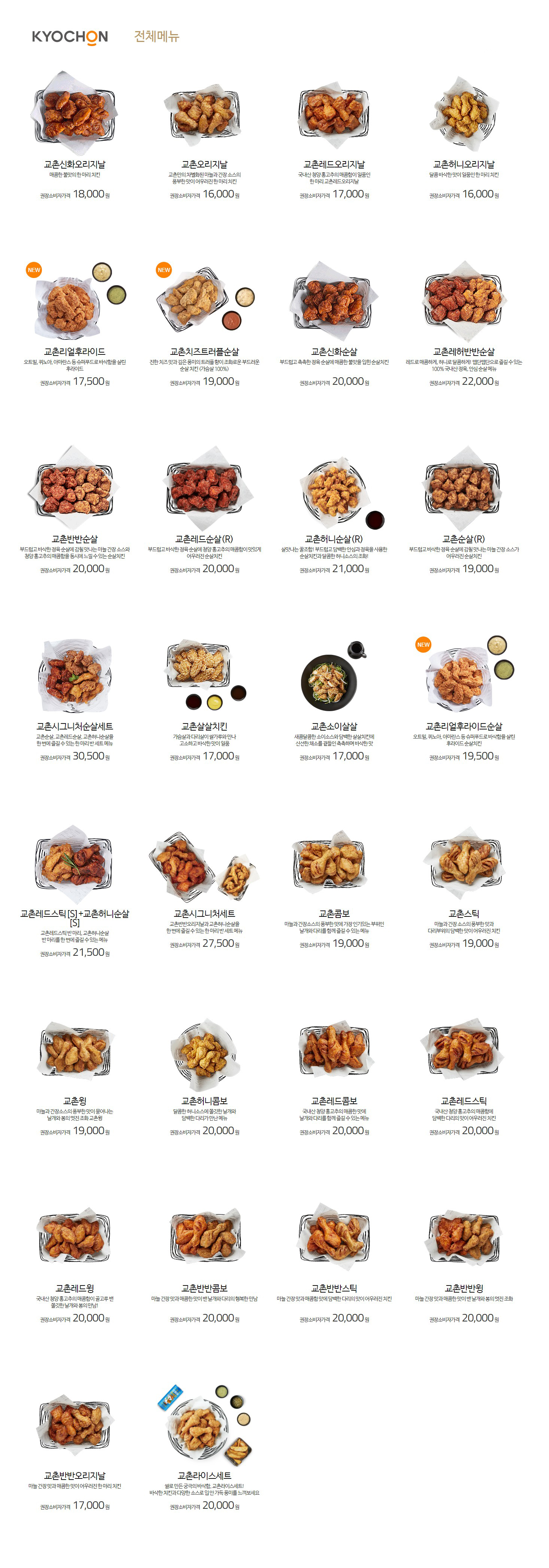 사이트에 올라와 있는 치킨 전메뉴 가격표입니다.